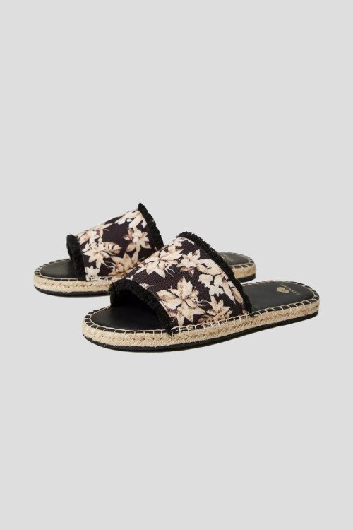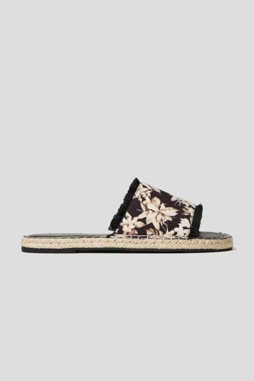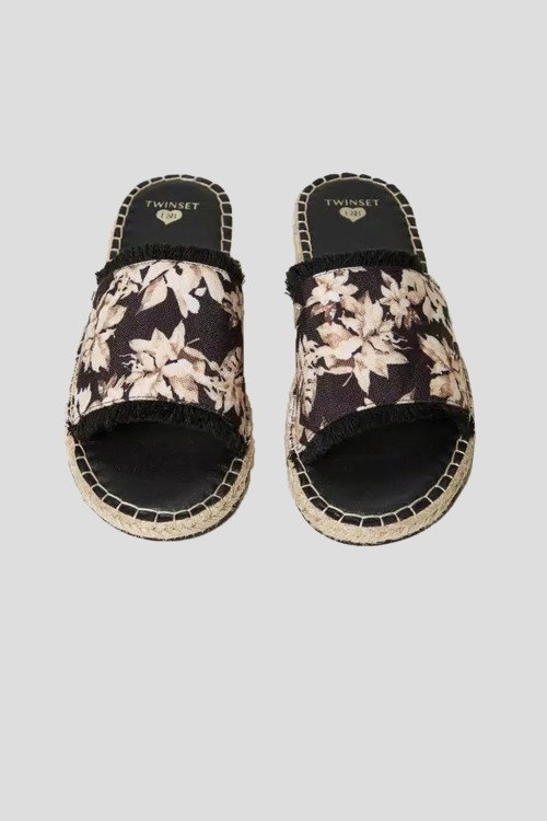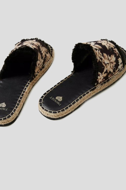 Детали: Женские черные текстильные шлепанцы от TWINSET (Твинсет). Широкий ремешок с цветочным принтом и краями с бахромой, закругленный носок, плетеная подошва