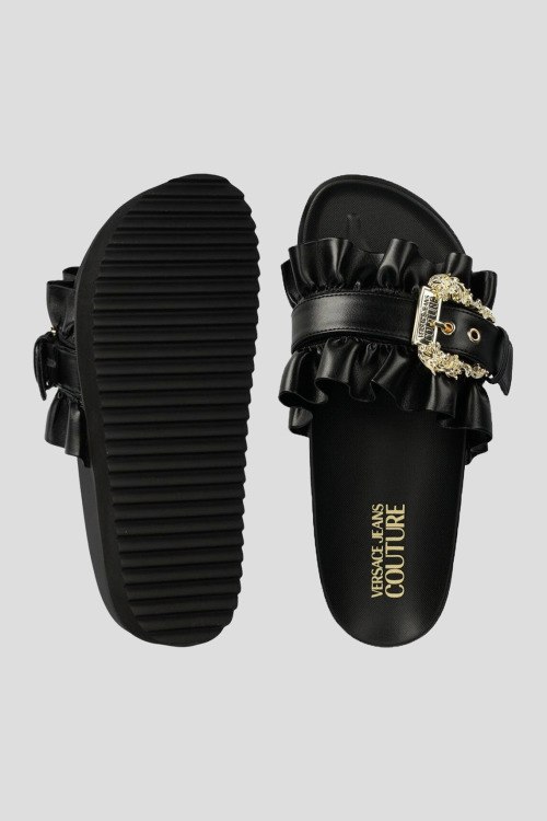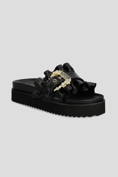 Детали: Женские черные шлепанцы из полиуретана от Versace Jeans Couture (Версаче Джинс Кутюр). Закругленный носок, спереди ремешок с металлической пряжкой, логотип бренда, брендированная стелька, модель на платформе. Высота платформы: 5 см.