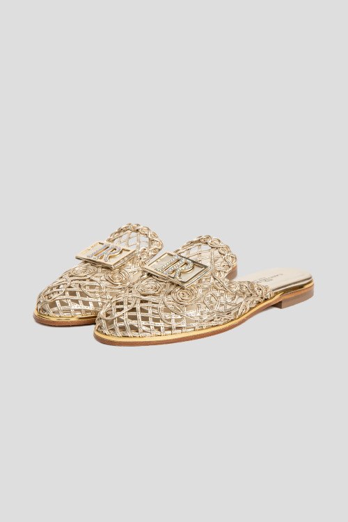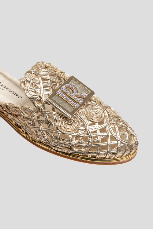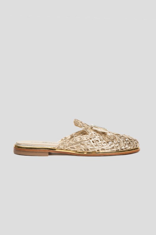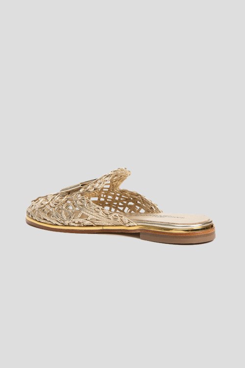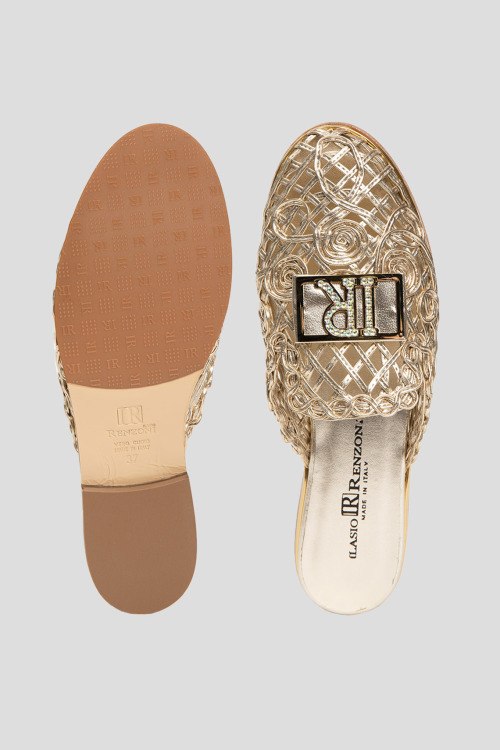 Детали: Женские золотистые шлепанцы из натуральной кожи от Ilasio Renzoni (Иласио Рензони). Закругленный закрытый носок, плетенный дизайн, плоская подошва, кожаная стелька с логотипом бренда