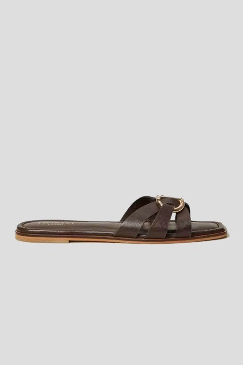 Детали: Женские темно-коричневые кожаные шлепанцы от TWINSET (Твинсет). Модель из гладкой кожи, золотистый логотип, квадратный носок, плоская подошва