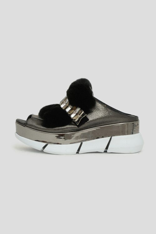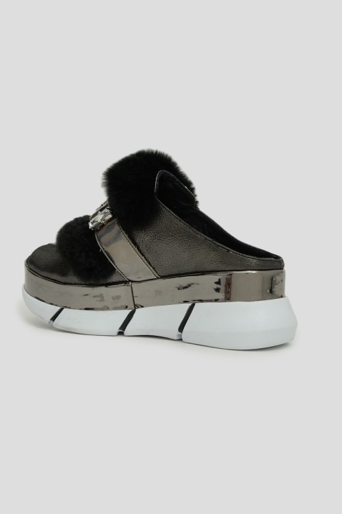 Шлепанцы серебряного цвета из натуральной кожи. Высокая рельефная подошва, спереди украшены нашивкой с мехом