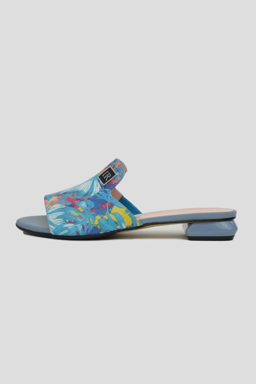 Шлепанцы нежно-голубого цвета с ярким принтом из натуральной кожи. Закругленный открытый носок, кожаная стелька с фирменным логотипом бренда, Измерения: высота каблука 2,5 см