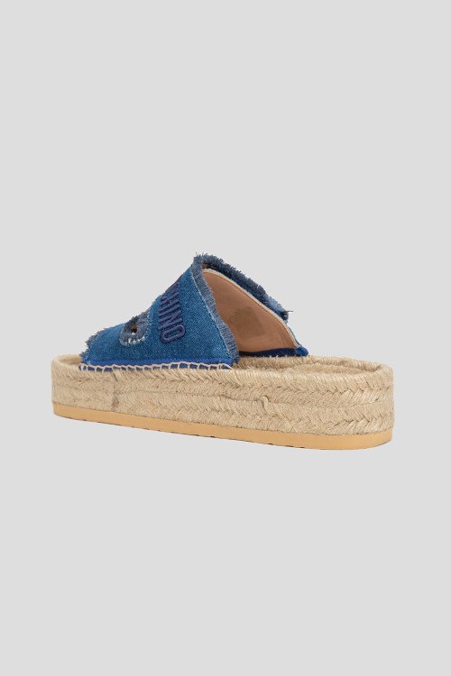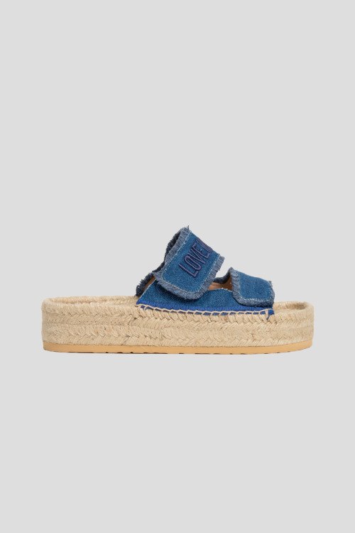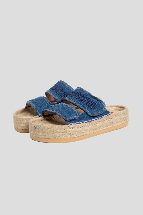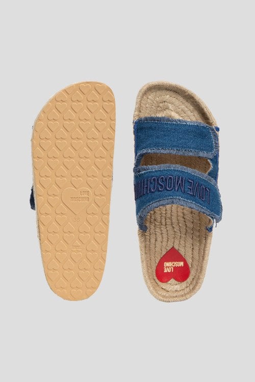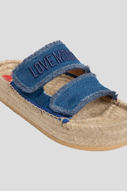 Детали: Женские синие джинсовые шлепанцы из хлопка от Love Moschino (Лав Москино). Закругленный носок, плетенный дизайн, анатомическая стелька, ремешки на липучке, вышитый логотип бренда, толстая подошва с плетенными элементами