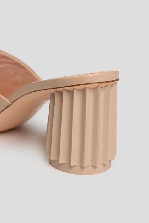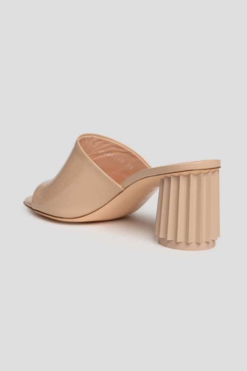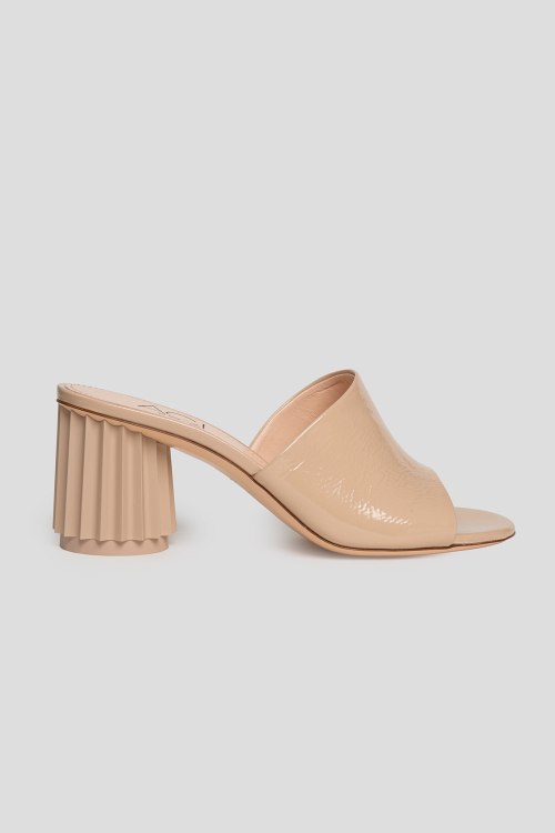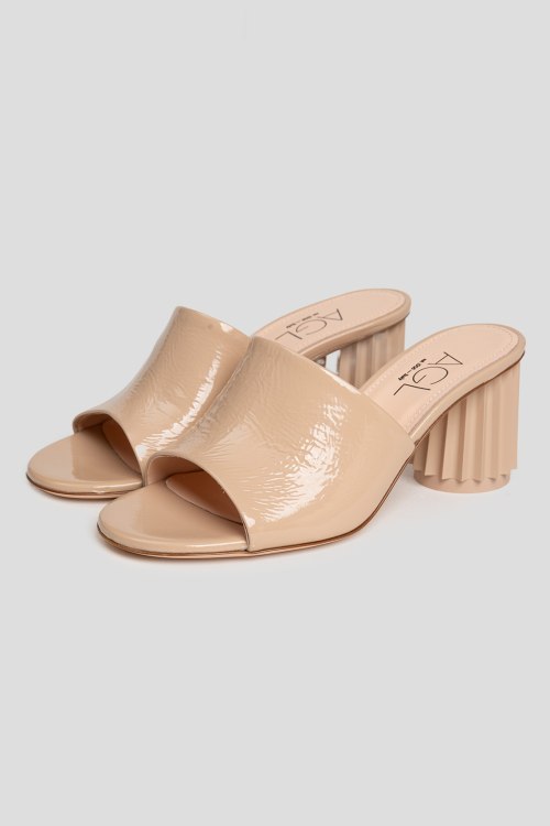 Детали: Женские бежевые шлепанцы из натуральной кожи от AGL (Аттилио Джусти Леомбруни). Закругленный носок, широкий ремешок из лаковой кожи, высокий устойчивый каблук. Измерения: каблук: 8 см