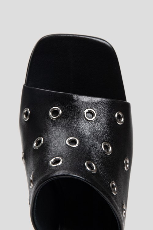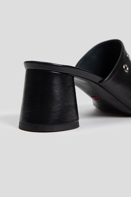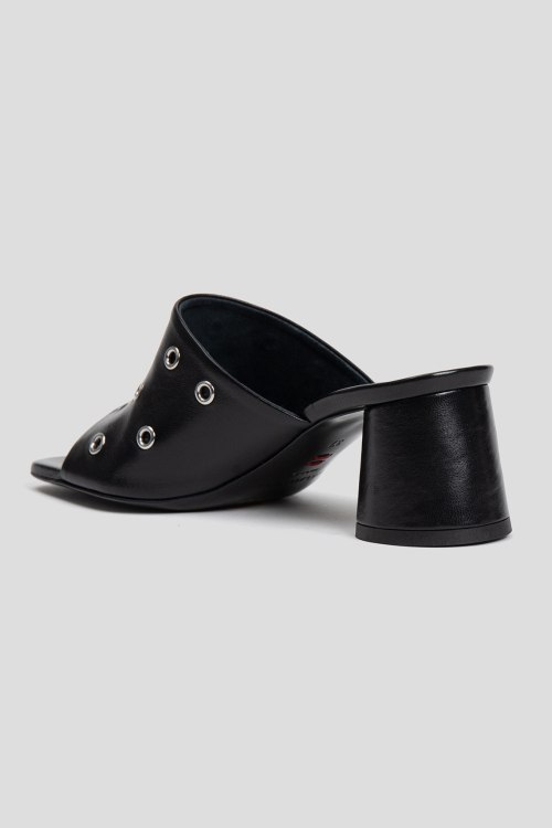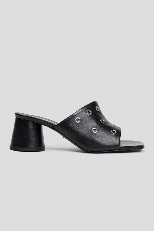 Детали: Женские черные шлепанцы из натуральной кожи от Halmanera (Халманера). Квадратный носок, широкий ремешок с металлической фурнитурой, широкий каблук высотой 6,5 см