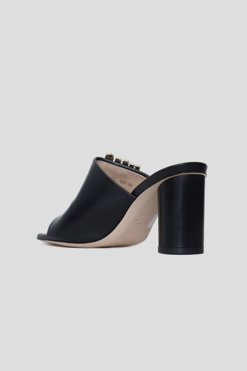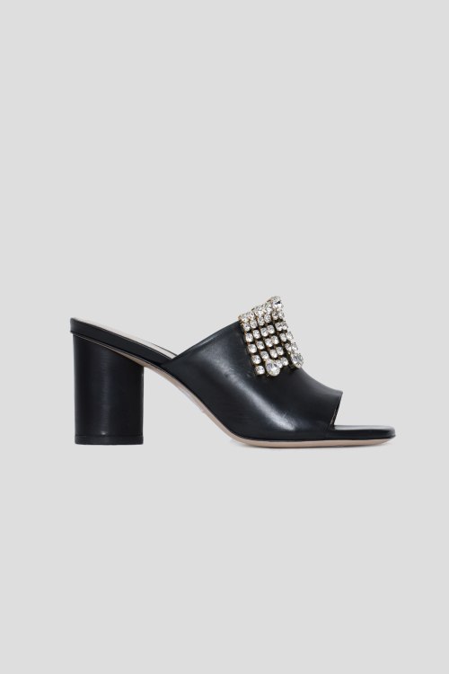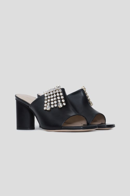 Детали: Женские черные шлепанцы на каблуке из натуральной кожи от Stuart Weitzman (Стюарт Вейцман). Модель без застежки, открытые носок и пятка, декор камнями, широкий каблук. Измерения: высота каблука 9 см