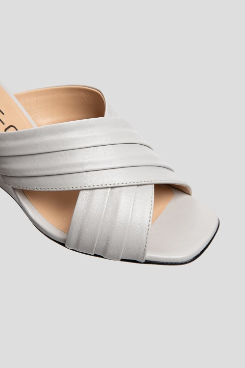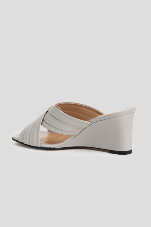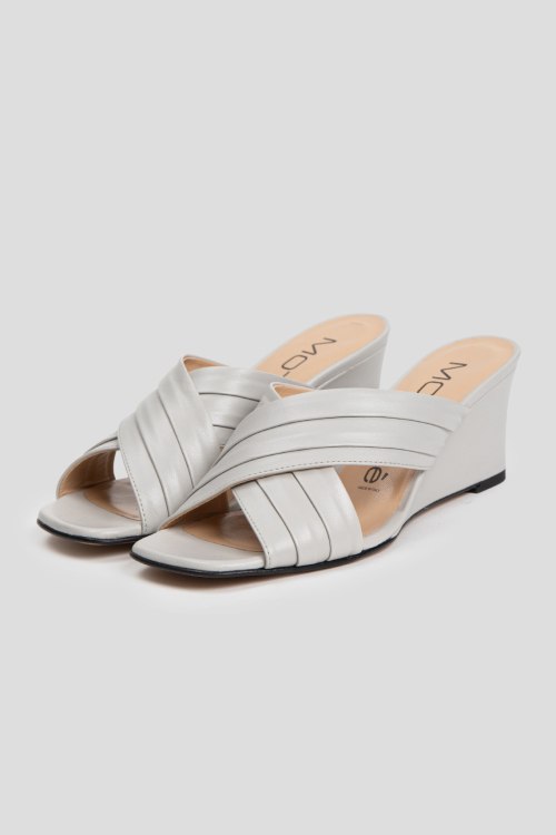 Детали: Женские светло-серые шлепанцы из натуральной кожи от Mot-Cle (Мот-Кле). Модель на танкетке высотой 7 см, квадратный носок, кожаная стелька с логотипом бренда, перекрестные ремешки спереди