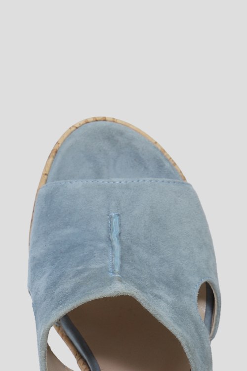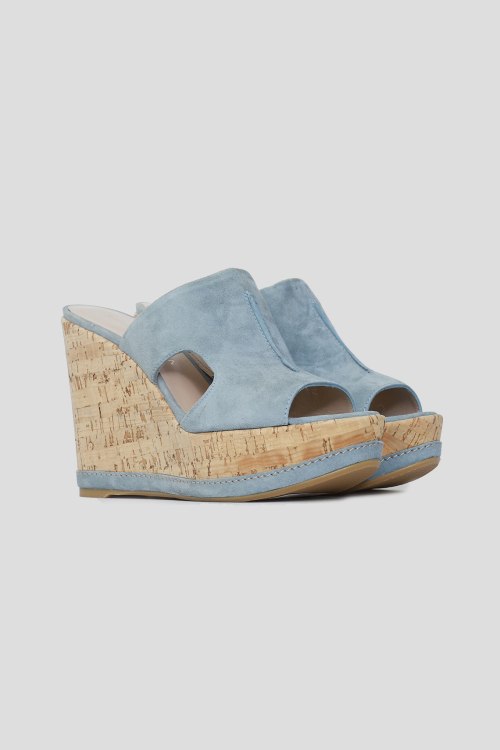 Детали: Женские голубые шлепанцы на танкетке из натуральной замши от Stuart Weitzman (Стюарт Вейцман). Модель без застежки, открытые носок и пятка, высокая пробковая танкетка. Измерения: высота платформы 4 см, высота танкетки 12 см