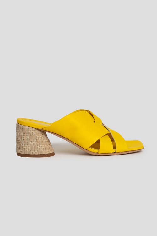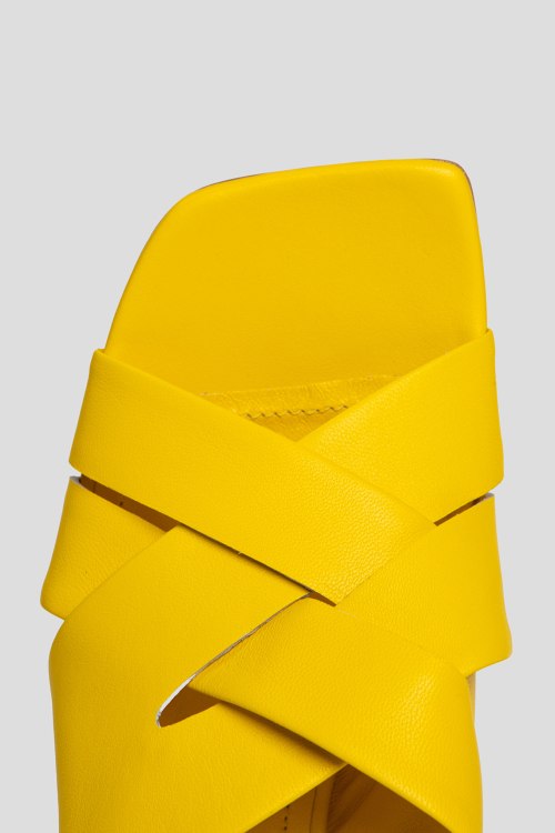 Детали: Женские желтые шлепанцы из натуральной кожи от Hestia Venezia (Эстиа Венеция). Квадратный носок, перекрестные ремешки, кожаная стелька, широкий устойчивый каблук с плетением. Измерения: каблук 6,5 см