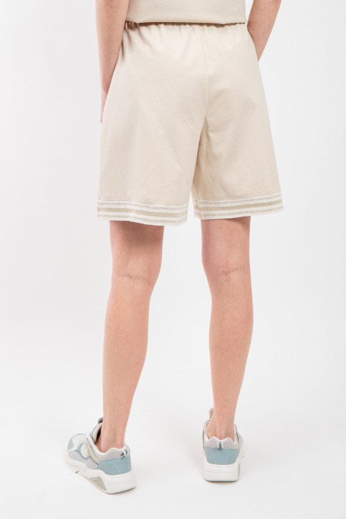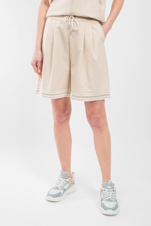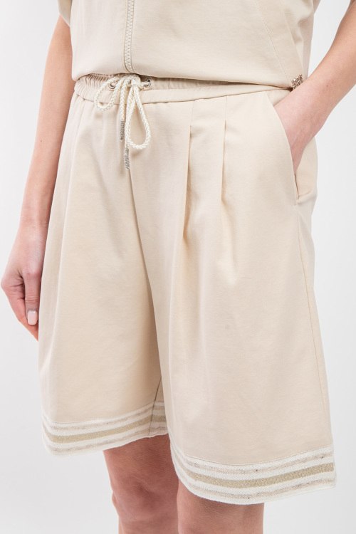 Женские бежевые шорты из хлопкового микса от Panicale Cashmere (Паникале Кашемир). Свободный силуэт, эластичная резинка на поясе с кулиской, прорезные карманы. Замеры для размера 42: длина: 48,5 см, ширина по поясу (резинка): 39 см, ширина по бёдрам: 47 см, ширина штанины вверху: 35 см, высота сидения: 37 см.