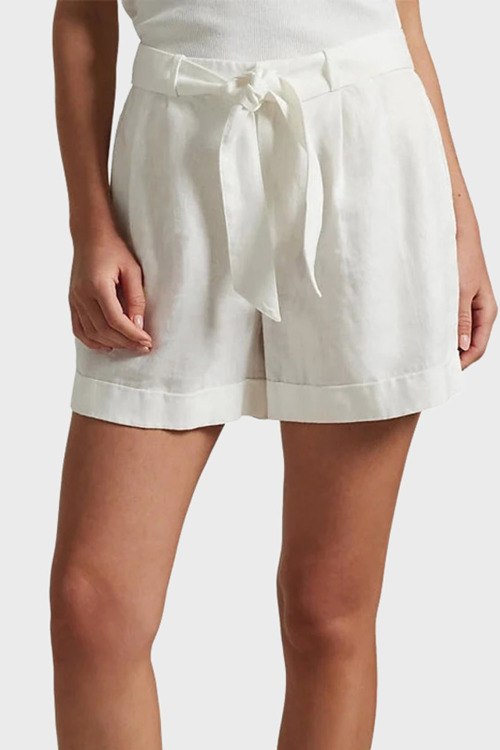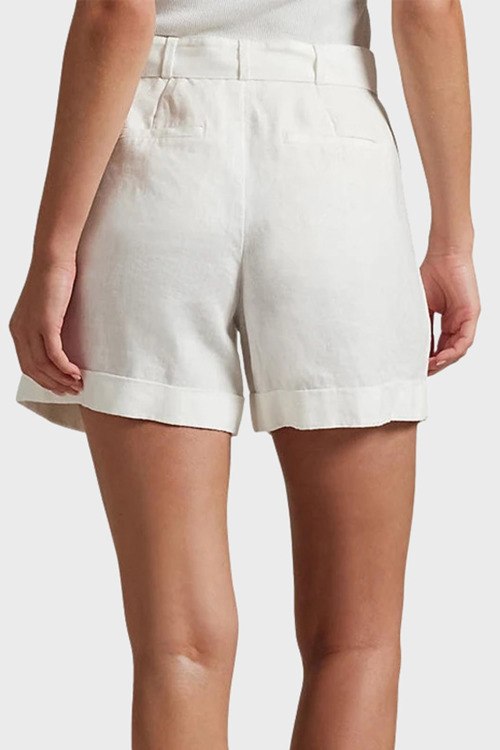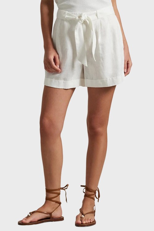 Детали: Женские шорты молочного оттенка из льна от Polo Ralph Lauren (Поло Ральф Лорен). Короткая длина, высокая посадка, застежка на молнию, пояс в тон изделия, прорезные карманы