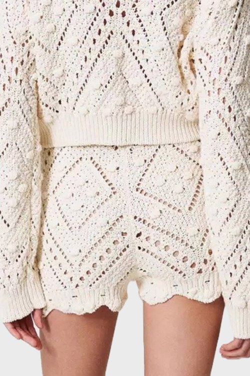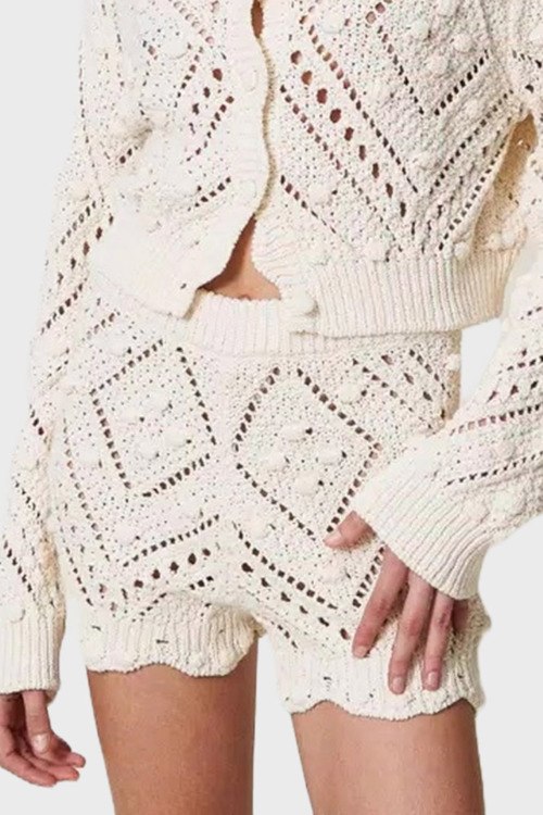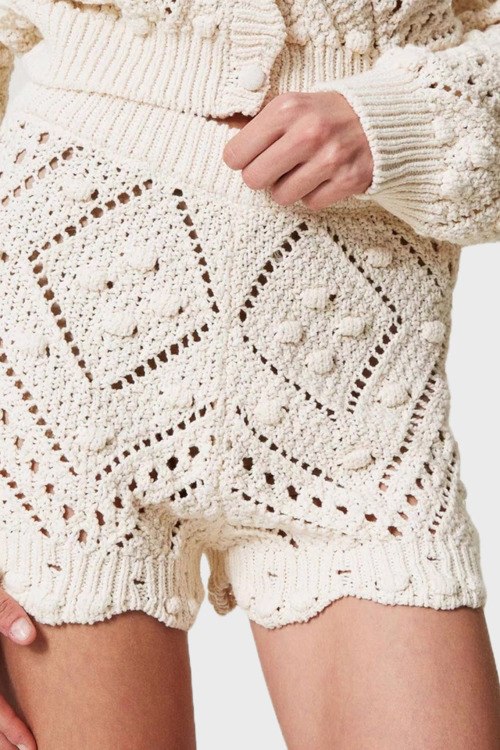 Детали: Женские шорты молочного оттенка из хлопкового микса от TWINSET (Твинсет). Кружевная модель, высокая посадка, эластичная резинка на поясе