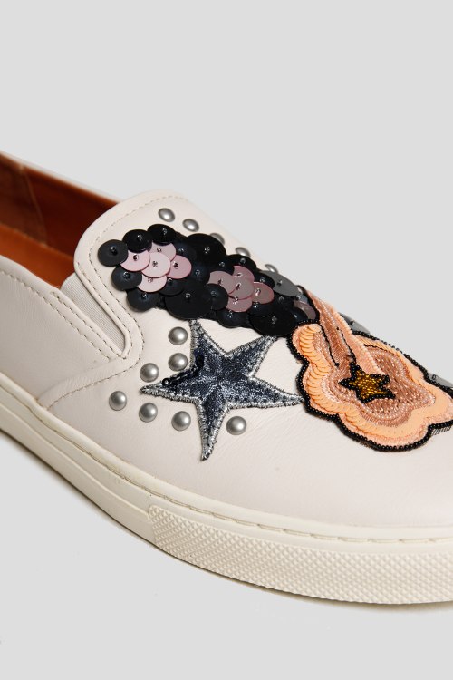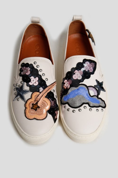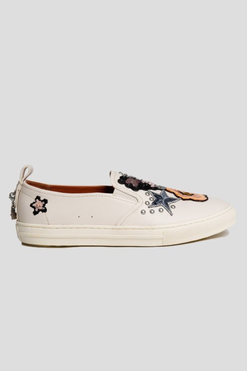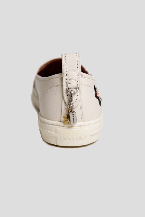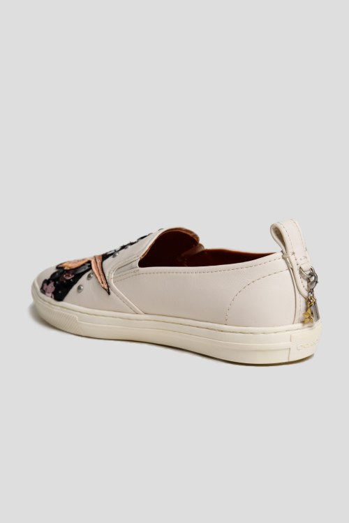 Женские слипоны молочного оттенка из натуральной кожи от Coach (Коуч). Модель Coach G1925. Закругленный носок, эластичные вставки по бокам, петля для подтягивания, кожаная стелька с логотипом бренда, декорированы вышитыми нашивками с блестящими пайетками и полированными заклепками, тиснение с логотипом бренда, подошва в тон изделия
