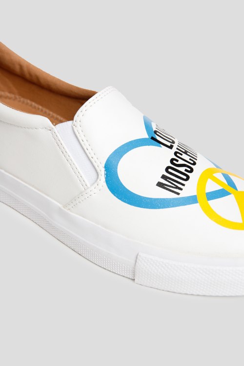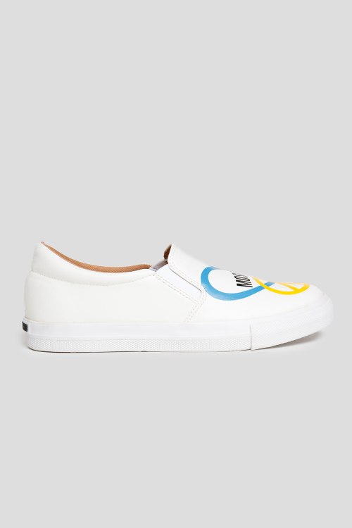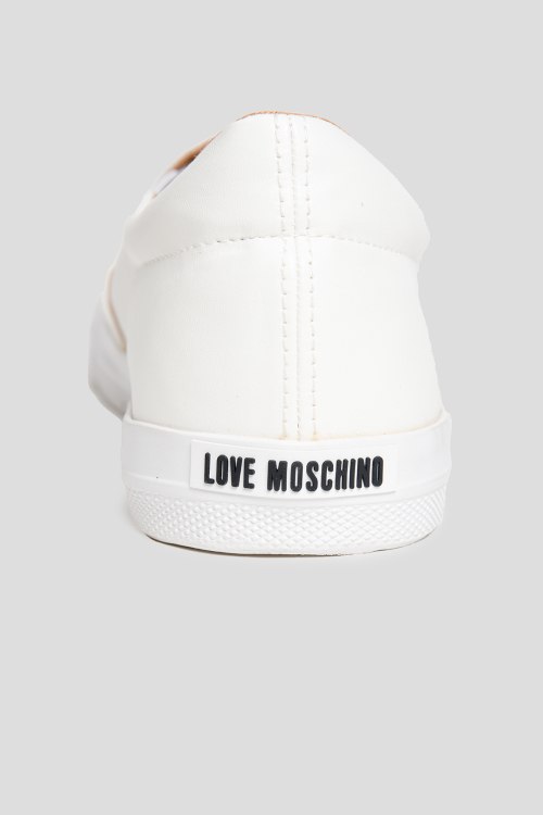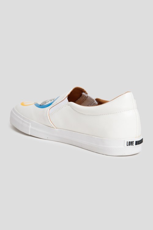 Детали: Женские белые слипоны из экокожи от Love Moschino (Лав Москино). Эластичные резинки по бокам, принт с логотипом спереди, закругленный носок, резиновая подошва