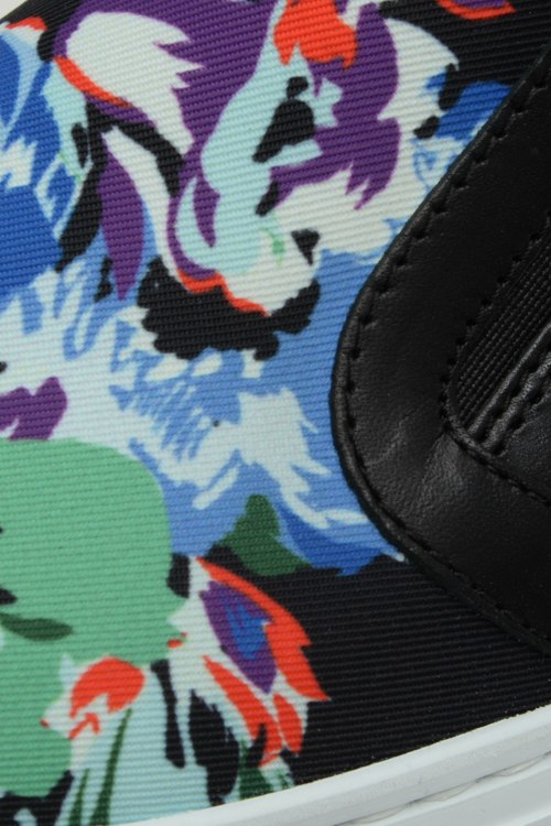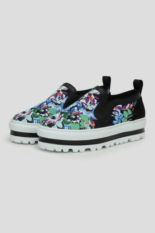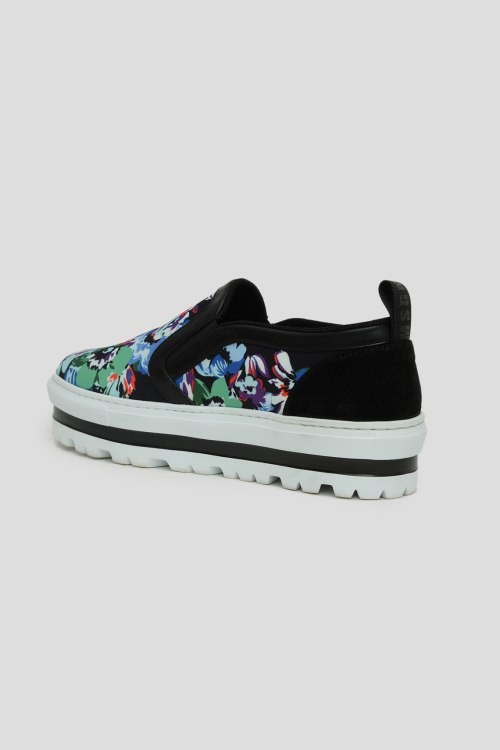 Детали: Слипоны черного цвета из текстиля и натуральной кожи. Закругленный носок, высокая рельефная подошва. Декорированы ярким цветочным принтом