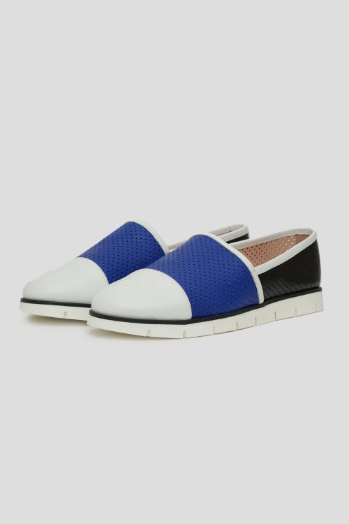 Слипоны в комбинации трьох цветов - синего, белого и черного из перфорированной натуральной кожи. Закругленный носок, рельефная подошва, на носке лаконичный тесненный логотип
