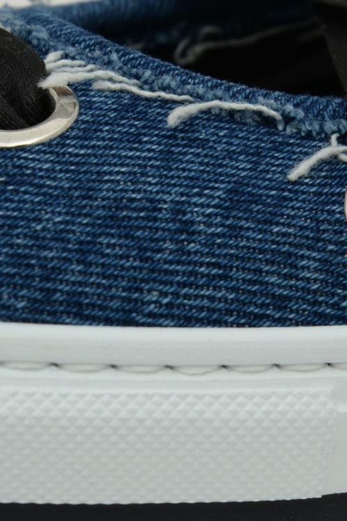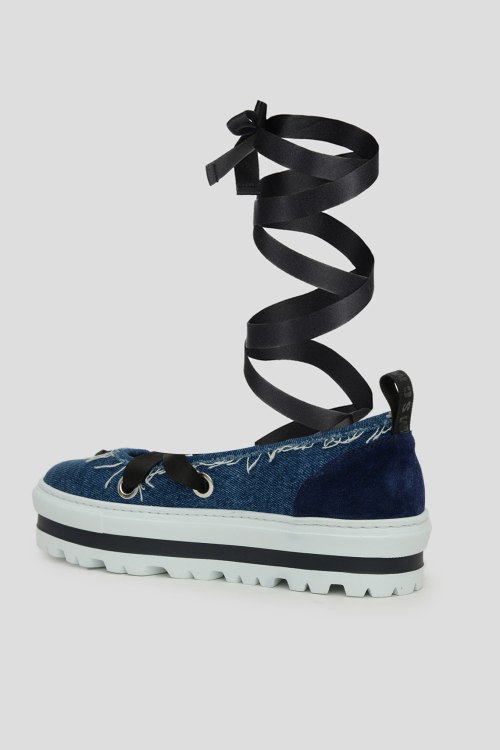 Детали: Джинсовые слипоны синего цвета. Закругленный носок, высокая рельефная подошва, завязываются на шнуровку