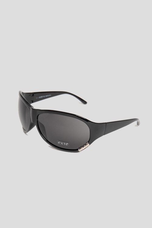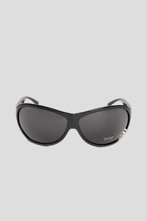 Детали: Женские черные солнцезащитные очки от Exte (Эксте). Овальные линзы черного цвета, тонкая ацетатная оправа, металлическая вставка с логотипом бренда. Фирменный чехол в комплекте