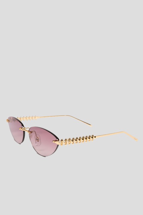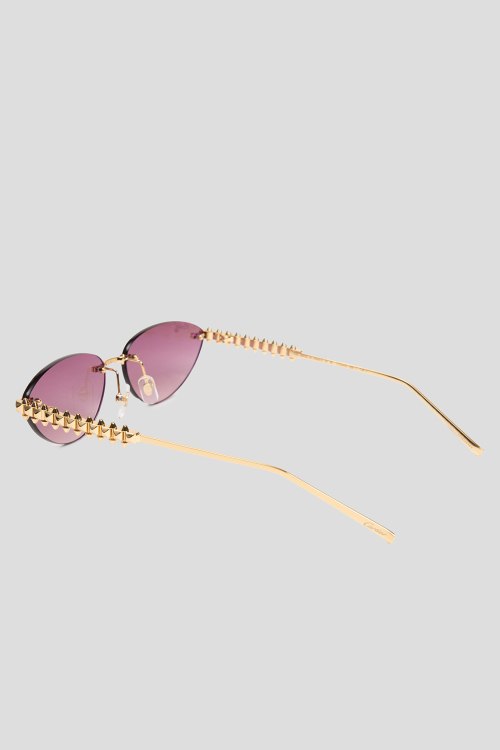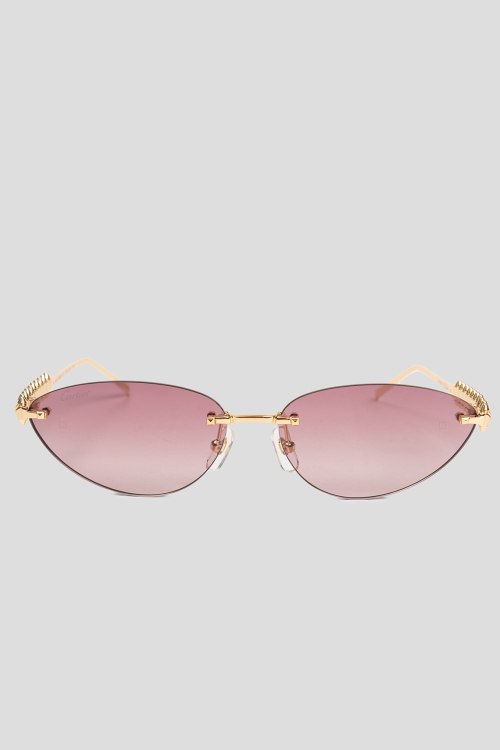 Детали: Женские солнцезащитные очки cat-eye от Cartier (Картье). Форма кошачий глаз, золотистая оправа, розовая линза с логотипом, декорированные дужки. Комплектация: чехол, салфетка, коробка. Размеры: 56*15*140