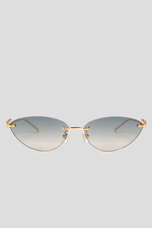 Детали: Женские солнцезащитные очки cat-eye от Cartier (Картье). Форма кошачий глаз, золотистая оправа, светлая линза с логотипом, декорированные дужки. Комплектация: чехол, салфетка, коробка. Размеры: 58*16*140