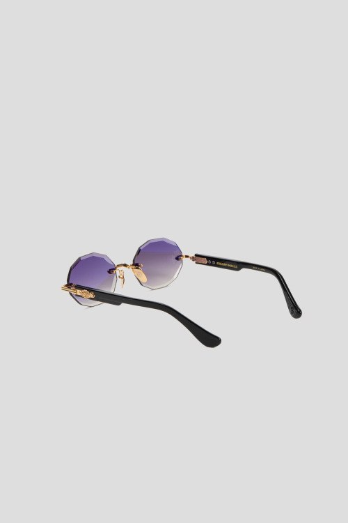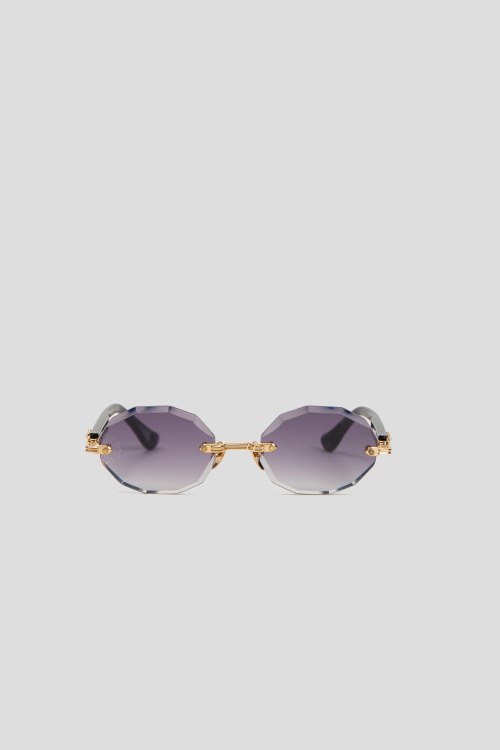 Детали: Женские солнцезащитные очки от Chrome Hearts (Хром Хартс). Черные дужки с золотистыми металлическими деталями, геометричная форма, темная линза с градиентом. Размеры: 56*21*146