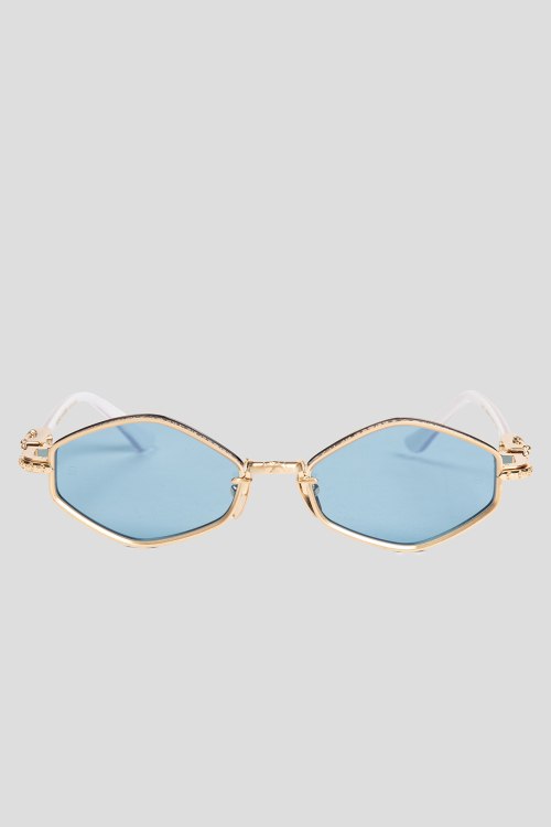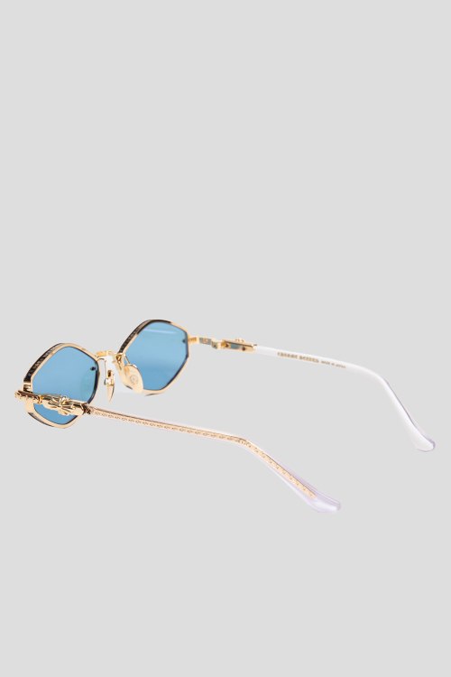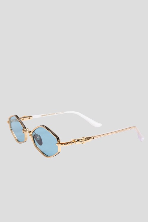 Детали: Женские солнцезащитные очки от Chrome Hearts (Хром Хартс). Геометрическая форма, золотистая оправа, голубая линза. Комплектация: чехол, салфетка, коробка. Размеры: 53*19*141