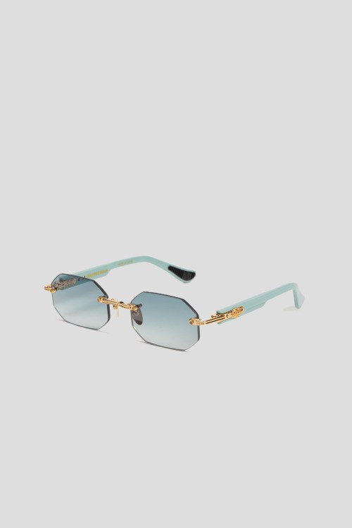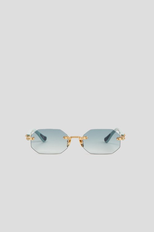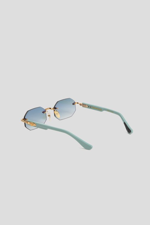 Детали: Женские солнцезащитные очки от Chrome Hearts (Хром Хартс). Голубые дужки с металлическими золотистыми деталями, геометричная форма, светлая линза с градиентом. Размеры: 55*21*146
