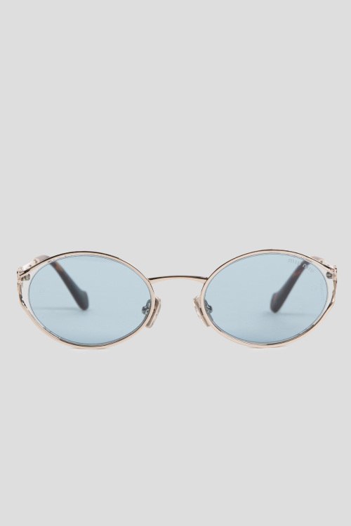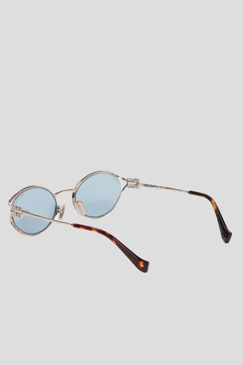 Детали: Женские голубые солнцезащитные очки от Miu Miu (Миу Миу). Серебристая оправа, овальная форма, голубая линза. Комплектация: чехол, мешочек, коробка, брендовый пакет