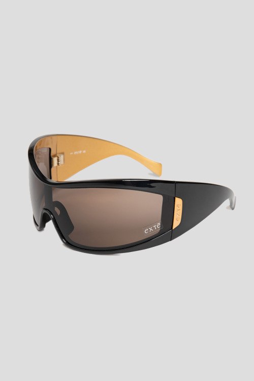 Женские коричневые солнцезащитные очки от Exte (Эксте). Прямоугольная форма, широкие дужки, ацетатная оправа черного цвета, затемненные коричневые линзы, логотип бренда. Товар не укомплектован фирменным чехлом и салфеткой