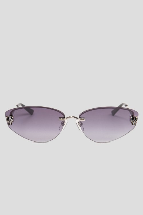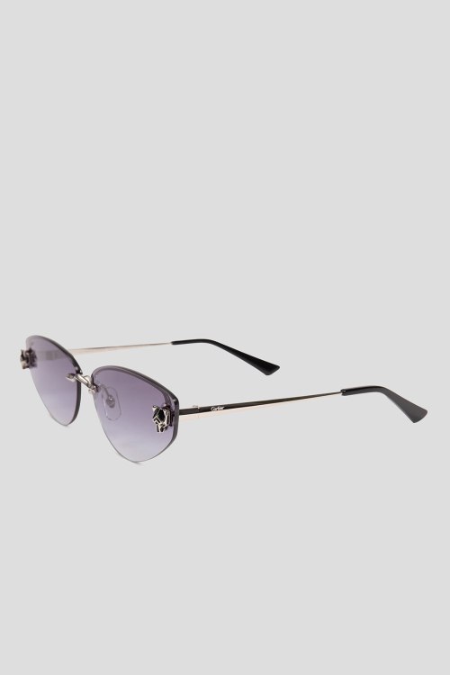 Детали: Женские солнцезащитные очки cat-eye от Cartier (Картье). Форма кошачий глаз, серебристая оправа, затемненная линза с логотипом. Комплектация: чехол, салфетка, коробка. Размеры: 65*15*140
