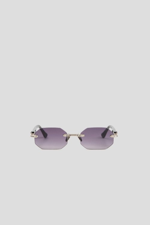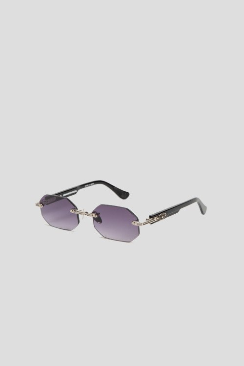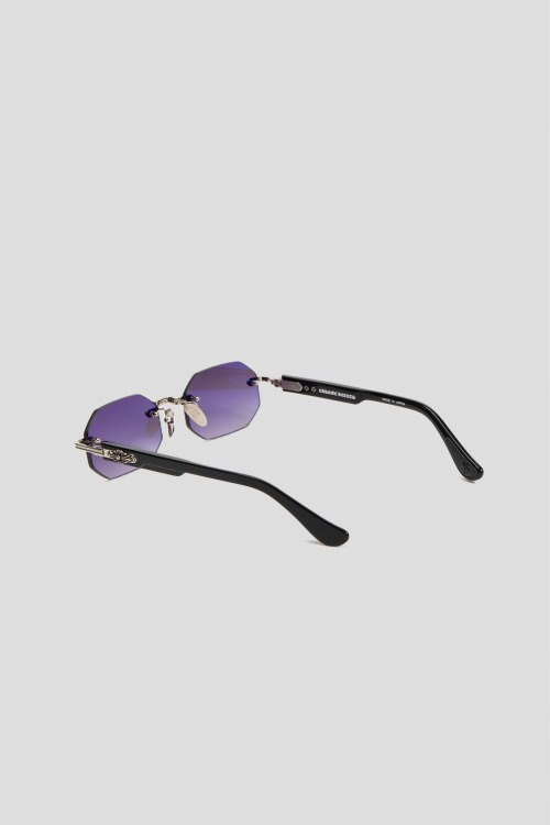 Детали: Женские солнцезащитные очки от Chrome Hearts (Хром Хартс). Черные дужки с металлическими серебристыми деталями, геометричная форма, темная линза с градиентом. Размеры: 55*21*146