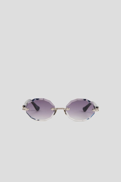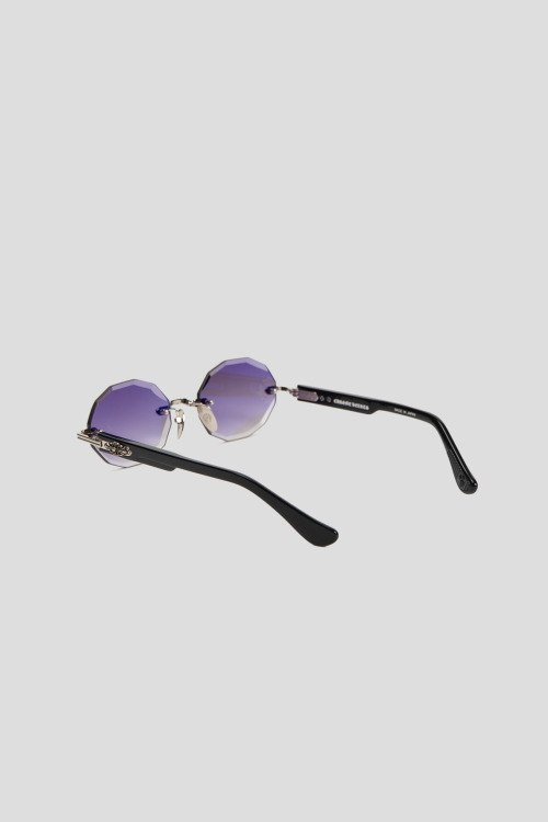 Детали: Женские солнцезащитные очки от Chrome Hearts (Хром Хартс). Черные дужки с серебристыми металлическими деталями, геометричная форма, темная линза с градиентом. Размеры: 56*21*146