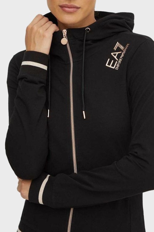 Детали: Женская черная спортивная кофта из хлопкового микса от EA7 Emporio Armani (ЕА7 Эмпорио Армани). Классическая длина, вшитый капюшон с кулиской, логотип бренда, трикотажная резинка на манжетах и по низу изделия, прорезные карманы