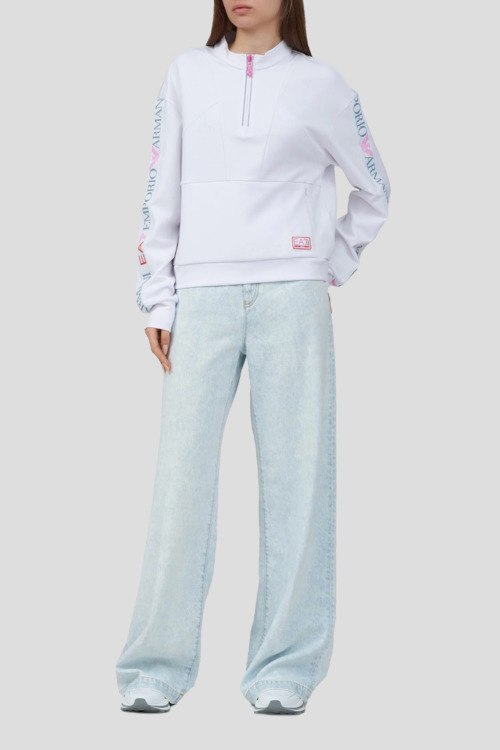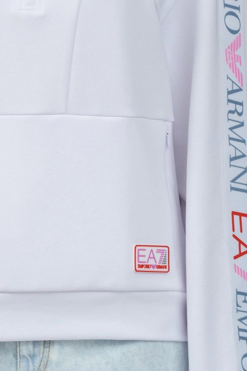 Детали: Женская спортивная кофта из микса полиэстера, хлопка и модала от Armani (Армани). Классическая длина, прямой фасон, длинные рукава, воротник-стойка, застежка на молнию, карман на молнии, патч-лого, принт логотипа на рукавах