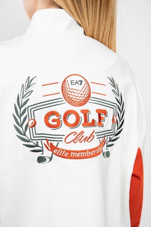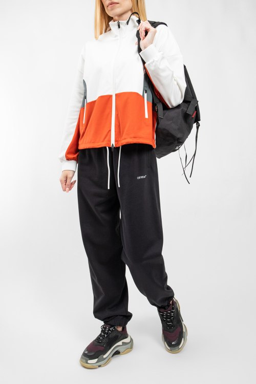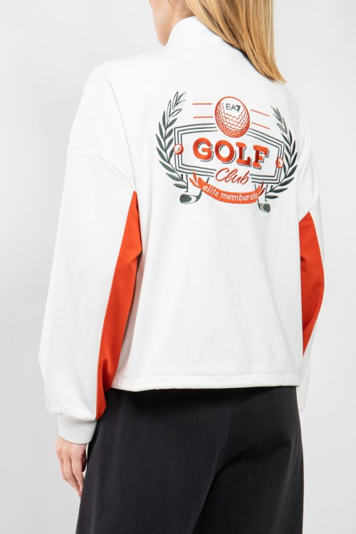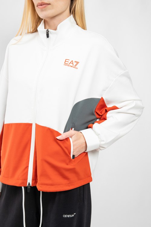 Женская бело-оранжевая спортивная кофта от EA7 Emporio Armani (ЕА7 Эмпорио Армани). Принт с логотипом на груди, принт с надписью на спине, боковые карманы на молнии, застежка-молния, нижний край на завязках, классическая длина.