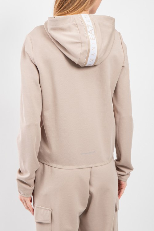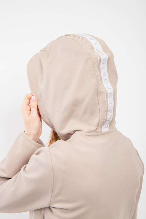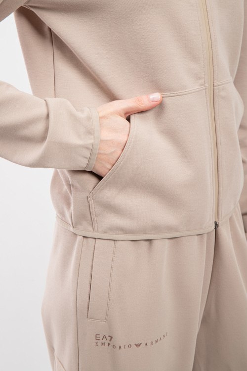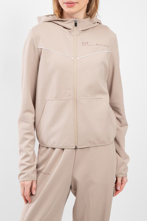 Женская бежевая спортивная кофта из полиэстера и хлопка от EA7 Emporio Armani (ЕА7 Эмпорио Армани). Классическая длина, застежка на молнию, вшитый капюшон, брендированные вставки, накладные карманы.