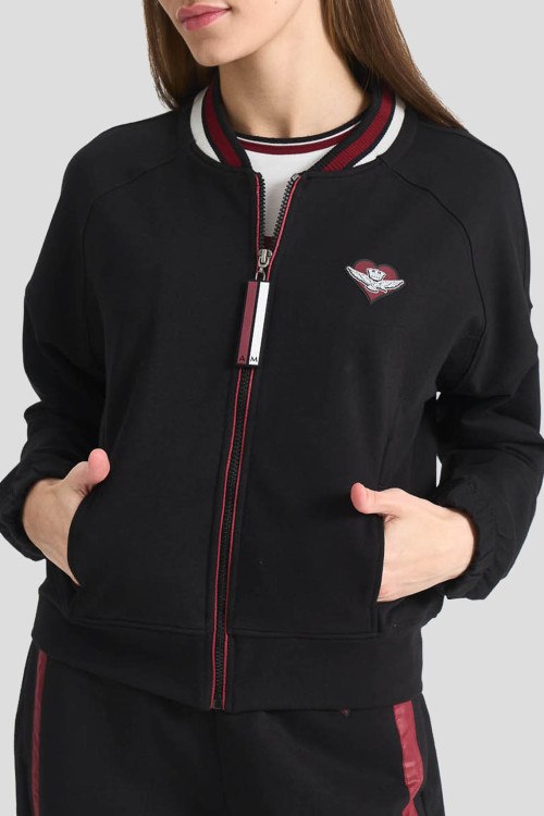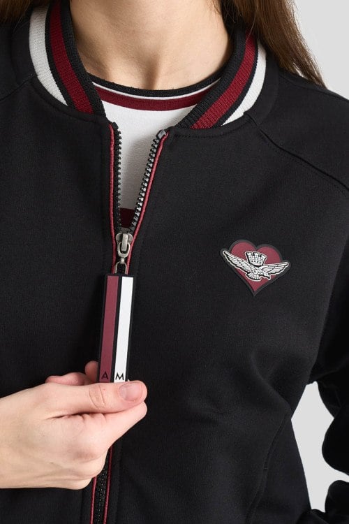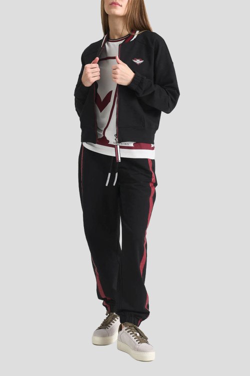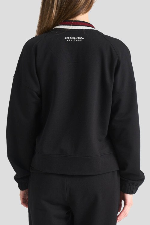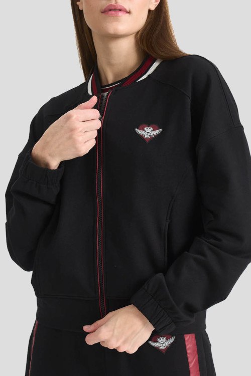 Детали: Женская черная спортивная кофта из хлопкового микса от Aeronautica Militare (Аэронавтика Милитари). Классическая длина, застежка на молнию, длинные рукава-реглан, манжеты и низу изделия на трикотажной резинке, брендированный принт на груди и на спине, прорезные карманы