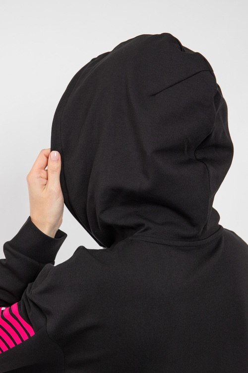 Женская черная спортивная кофта от EA7 Emporio Armani (ЕА7 Эмпорио Армани). Комбинация материалов, капюшон на завязках, логотип на рукавах, боковые карманы, застежка-молния, классическая длина, трикотажные манжеты и нижний край.