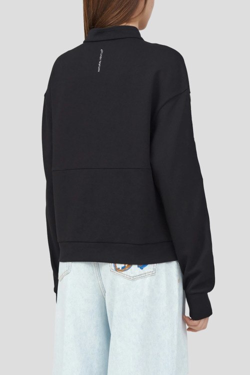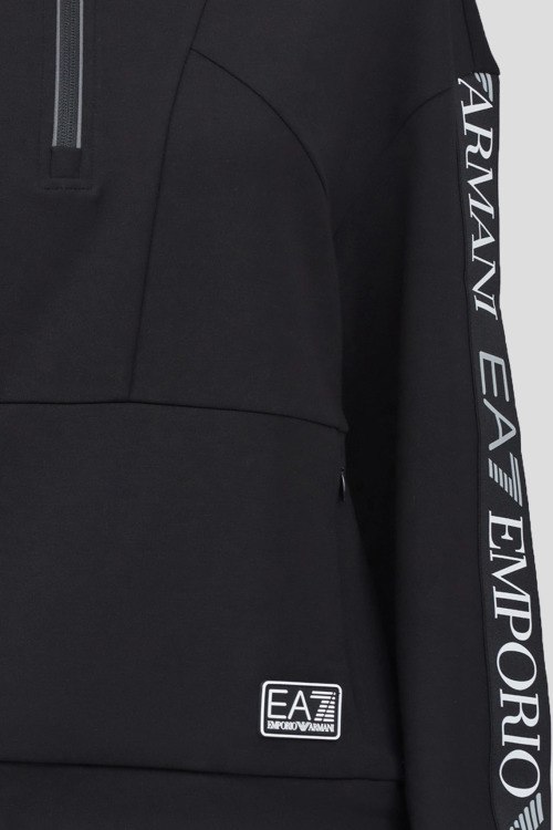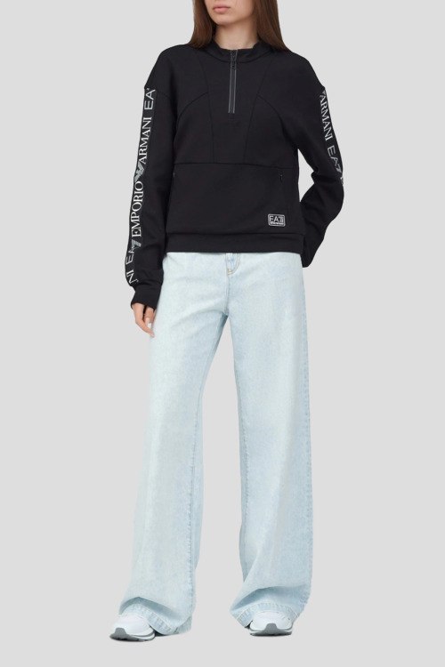 Детали: Женская черная спортивная кофта из микса полиэстера, хлопка и модала от Armani (Армани). Классическая длина, прямой фасон, длинные рукава, воротник-стойка, застежка на молнию, карман на молнии, патч-лого, принт логотипа на рукавах