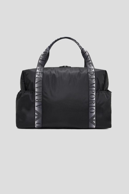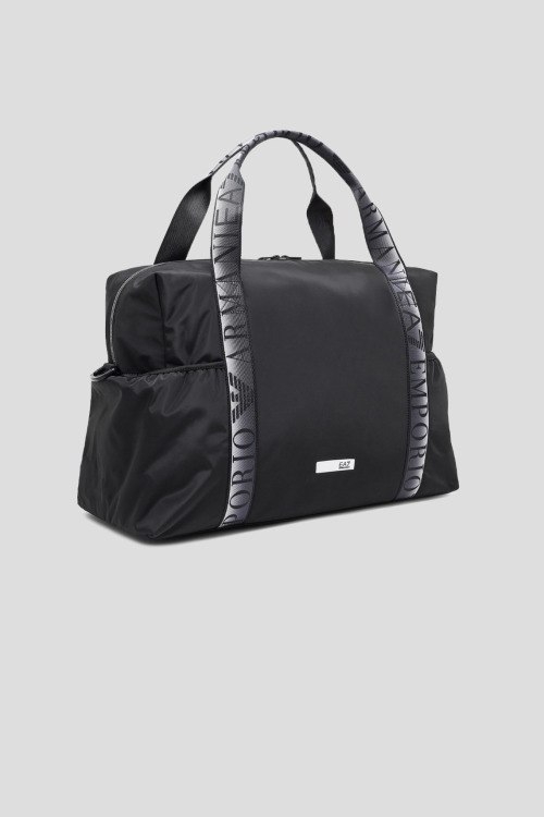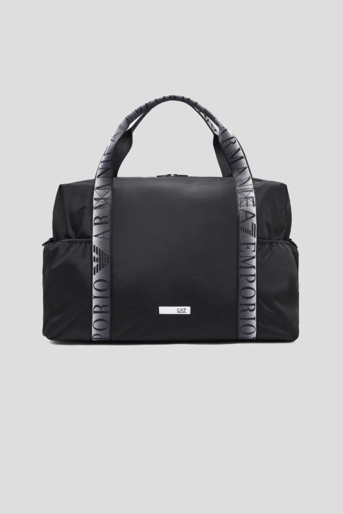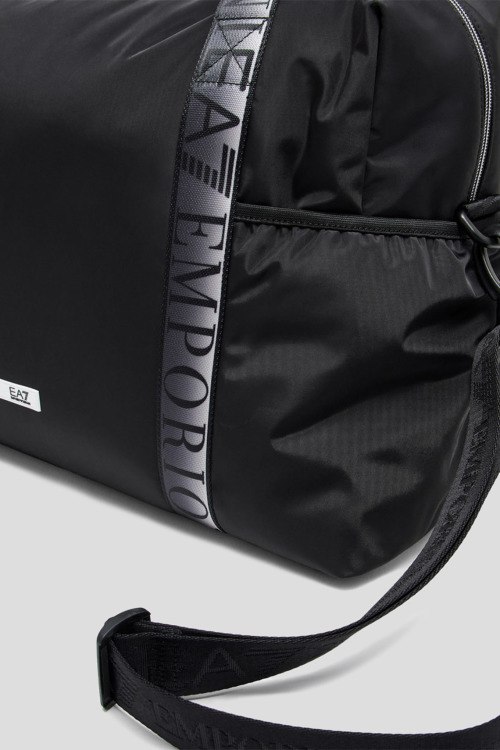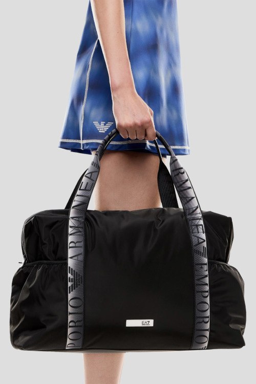 Детали: Женская черная текстильная спортивная сумка от EA7 Emporio Armani (ЕА7 Эмпорио Армани). Нашивка с логотипом, боковые карманы, две брендированные ручки, съемный плечевой ремень, застежка-молния, одно отделение. Минимальная длина ремня: 75 см. Максимальная длина ремня: 130 см. Длина ручек: 58 см. Размеры: глубина: 20 см, высота: 39 см, ширина у основания: 50 см