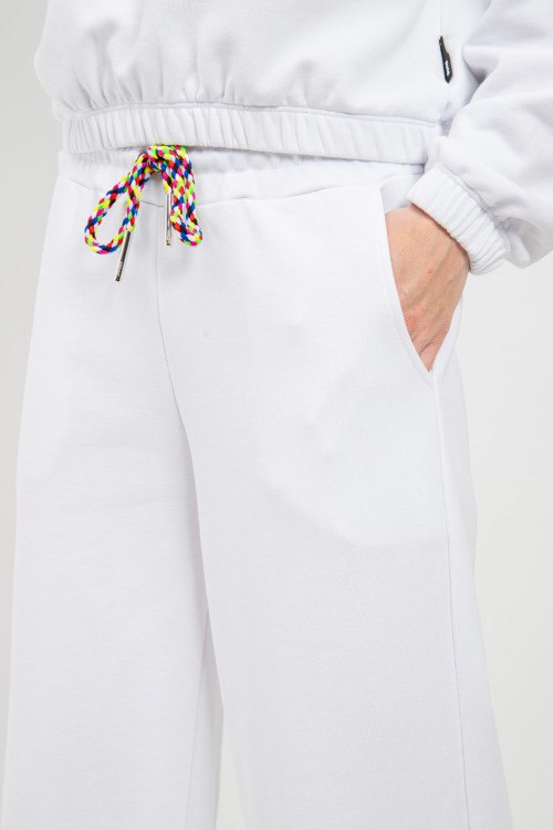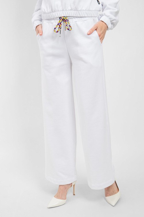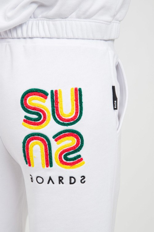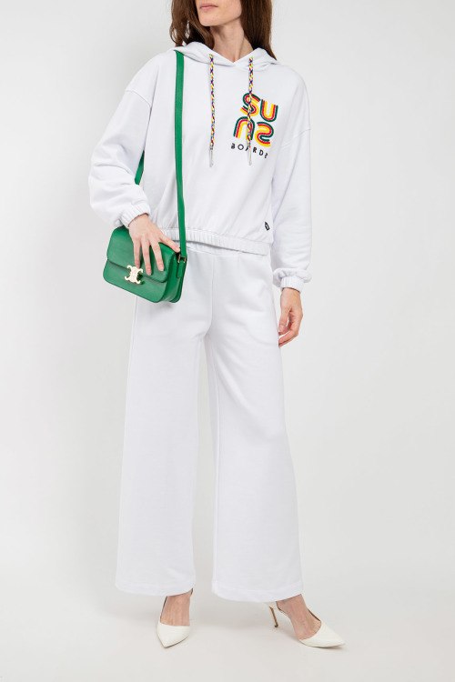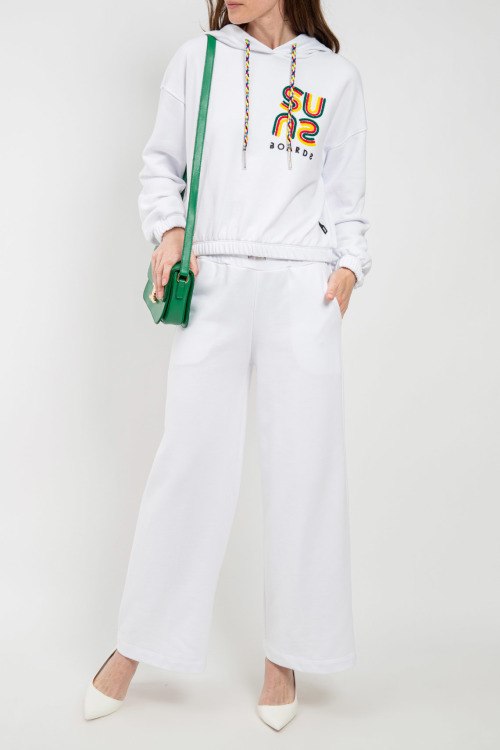Женские белые спортивные брюки из хлопкового микса от Suns Boards (Санс Боадс). Классическая длина, расклешенная модель, средняя посадка, эластичная резинка на поясе с кулиской, прорезные карманы, вышитый логотип бренда сзади.
