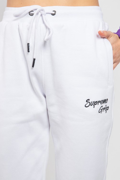 Женские белые спортивные брюки из хлопка от Supreme Grip (Суприм Грип). Классическая длина, эластичная резинка на поясе с кулиской, боковые карманы, трикотажная резинка на манжетах и по низу изделия, вышитый логотип бренда, модель утепленная флисом.
