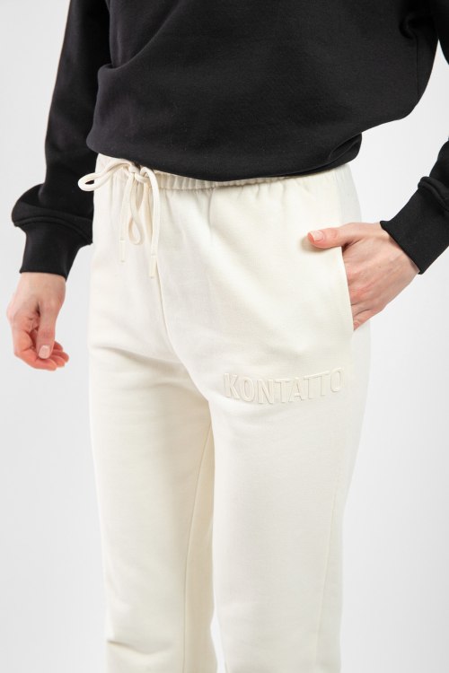 Женские спортивные брюки молочного оттенка из хлопка от Kontatto (Контатто). Классическая длина, дизайн с манжетами, эластичная резинка на поясе с кулиской, прорезные карманы, высокая посадка. Замеры для размера XS: Длина: 98 см, ширина по поясу (резинка): 36 см, ширина по бедрам: 43 см, ширина штанины вверху: 28 см, высота сидения: 36 см.