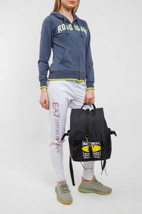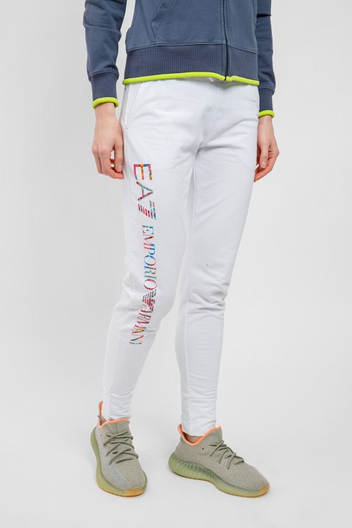Женские белые хлопковые спортивные брюки от Armani (Армани). Эластичный пояс на завязках, принт с логотипом, боковые карманы, полная длина.