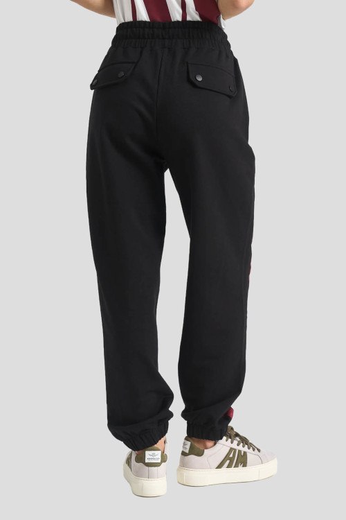 Детали: Женские черные спортивные брюки из хлопкового микса от Aeronautica Militare (Аэронавтика Милитари). Классическая длина, высокая посадка, эластичная резинка на поясе с кулиской, дизайн с контрастными лампасами, прорезные карманы, эластичная резинка на манжетах, брендированный принт