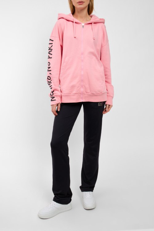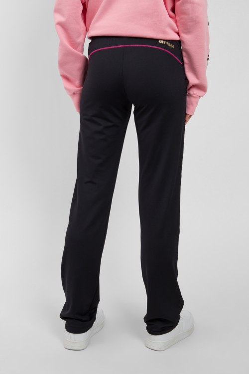 Женские черные спортивные брюки от Armani (Армани). Эластичный пояс, боковые карманы, принт с логотипом, свободный низ без манжетов, полная длина.