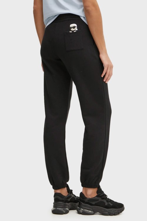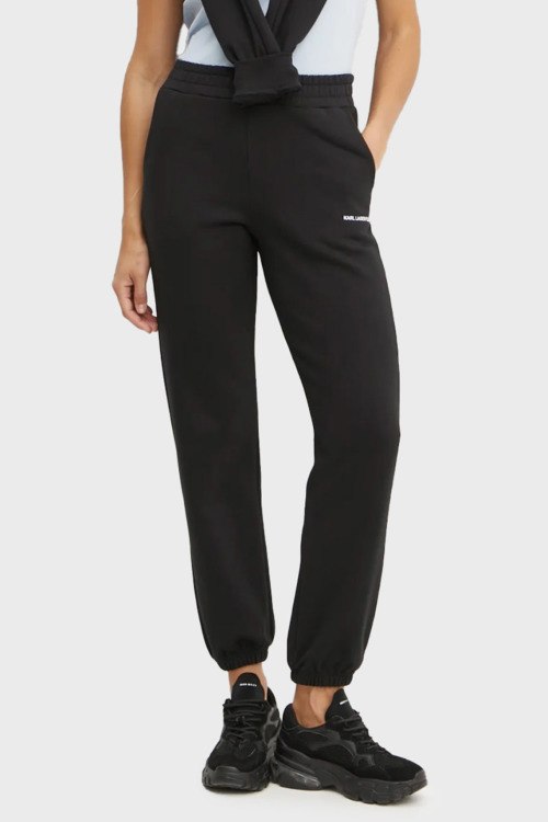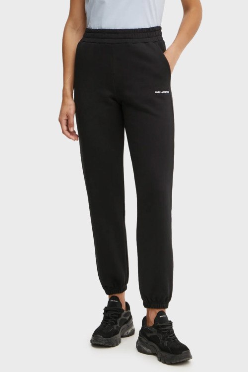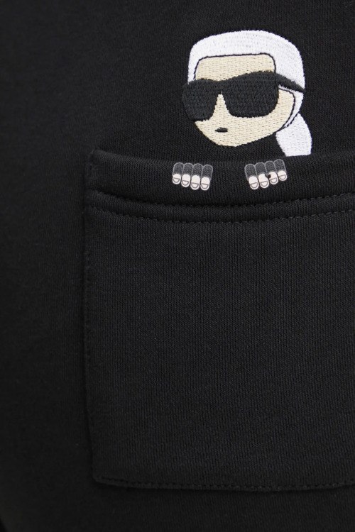 Детали: Женские черные спортивные брюки Ikon Peek-A-Boo из хлопкового микса от Karl Lagerfeld (Карл Лагерфельд). Классическая длина, эластичная резинка на поясе с кулиской, прорезные карманы, трикотажная резинка на манжетах, прорезные карманы, патч-лого