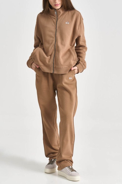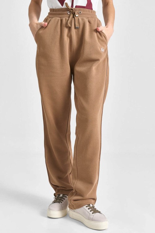Детали: Женские коричневые хлопковые спортивные брюки от La Martina (Ла Мартина). Эластичный пояс на завязках, боковые карманы, вышитый логотип, низ без манжетов, полная длина. Параметры модели: 83 см - 60 см - 90 см. Рост - 167 см. Размер на фото - 2