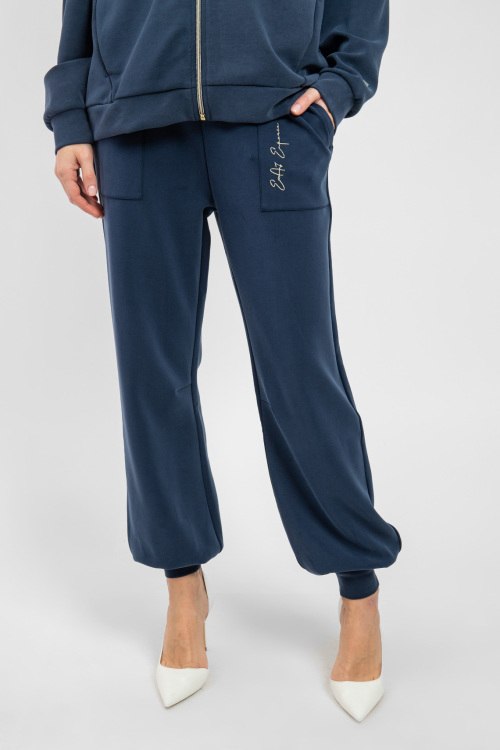 Женские синие спортивные брюки от EA7 Emporio Armani (ЕА7 Эмпорио Армани). Эластичный пояс на завязках, логотип спереди и сзади, боковые карманы, манжеты на резинке, полная длина.