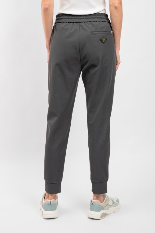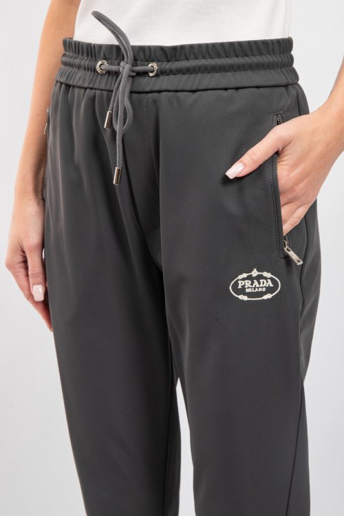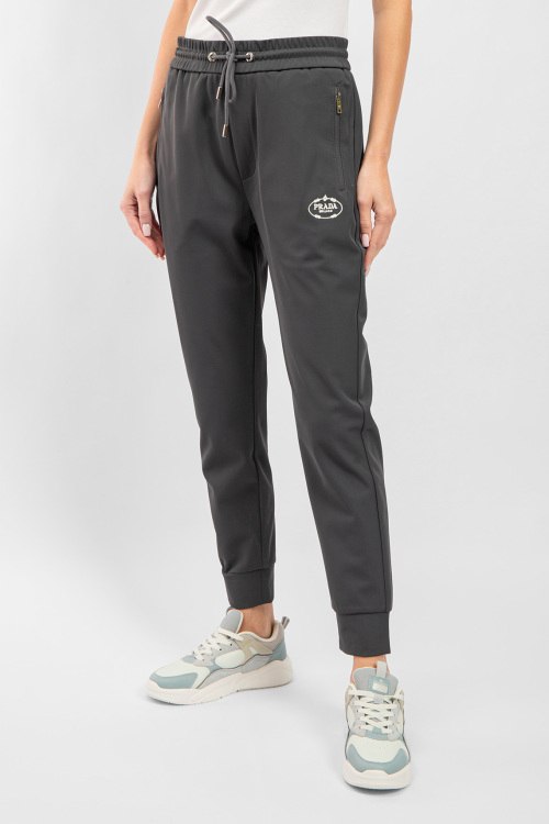 Детали: Женские темно-серые хлопковые спортивные брюки от Prada (Прада). Эластичный пояс на завязках, боковые карманы на молнии, накладной карман сзади, логотип спереди и сзади, трикотажные манжеты, полная длина
